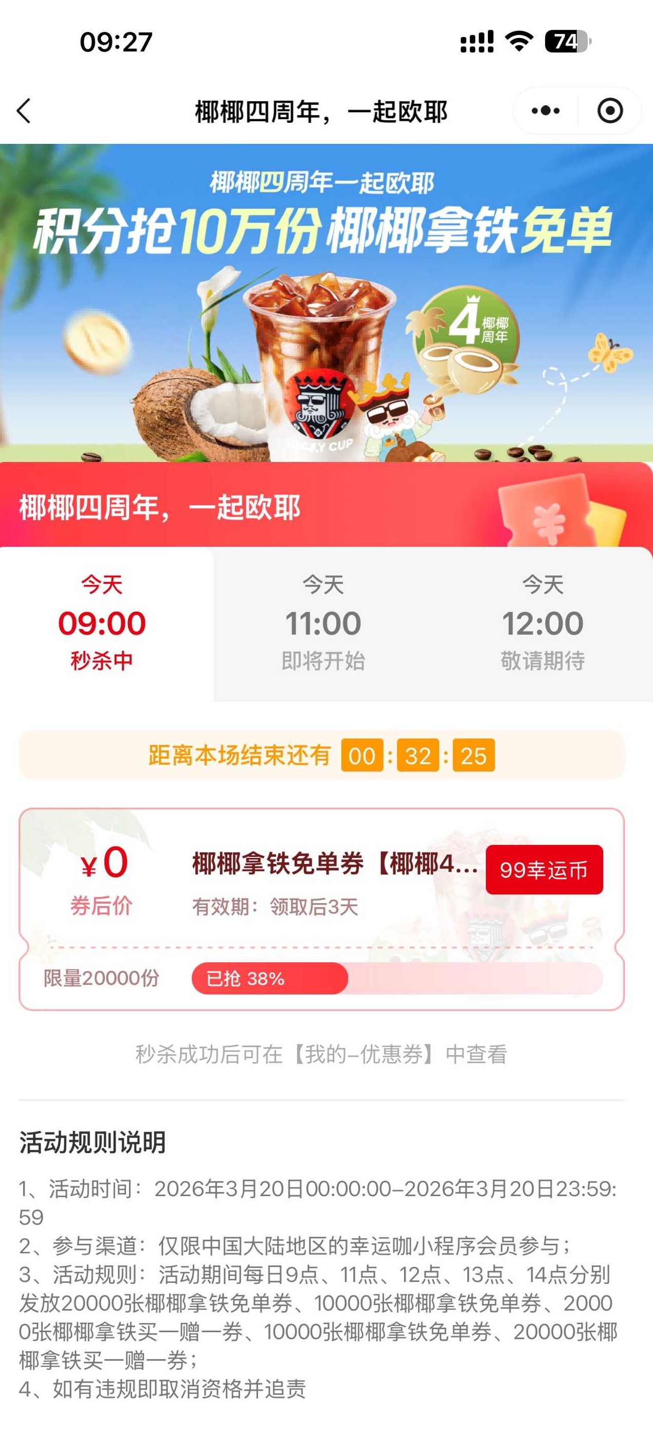 微信打开活动->今天9/11/13点用99幸运币,兑换椰椰拿铁免单券